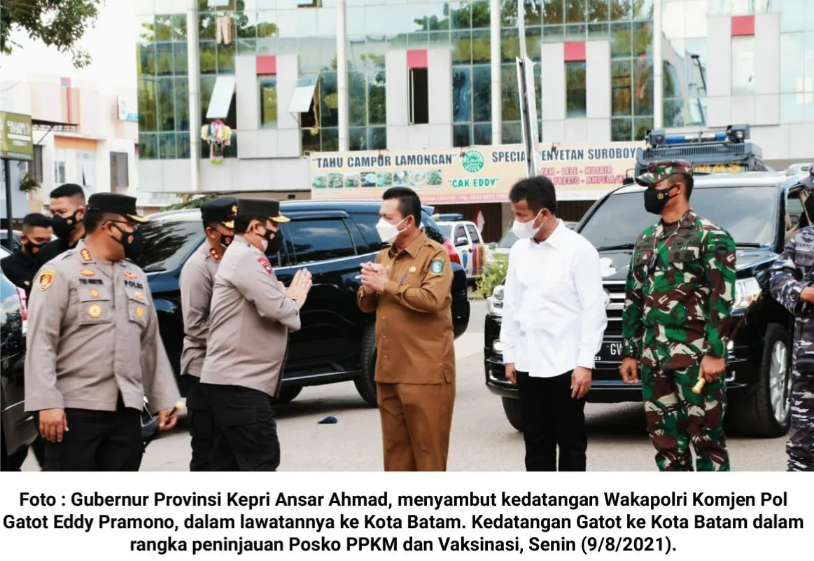 Batam (Kepri), cMczone.com – Gubernur Provinsi Kepulauan Riau (Kepri) Ansar Ahmad, mendampingi Wakapolri Komjen Pol Gatot Eddy Pramono, dalam lawatannya ke Kota Batam. Kedatangan Gatot ke Kota Batam dalam rangka peninjauan Posko PPKM dan Vaksinasi.