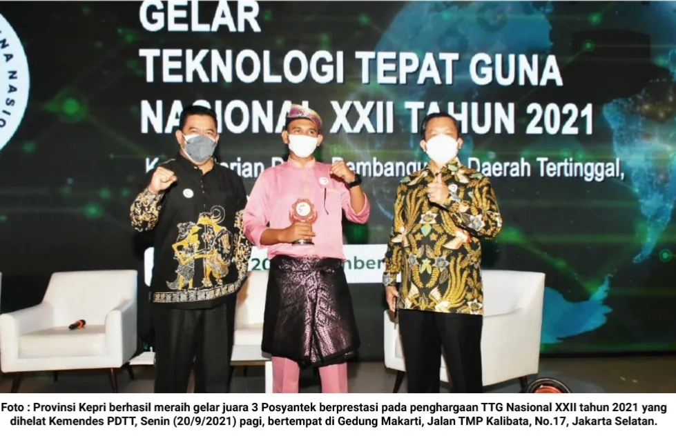 cMczone.com – Pos Pelayanan Teknologi Tepat Guna (Posyantek) Desa Teluk Bakau, Kabupaten Bintan, yang mewakili Provinsi Kepulauan Riau (Kepri) meraih juara 3 Nasional sebagai Posyantek Terbaik Tingkat Nasional dalam Lomba Inovasi Teknologi Tepat Guna (TTG) Tahun 2021.