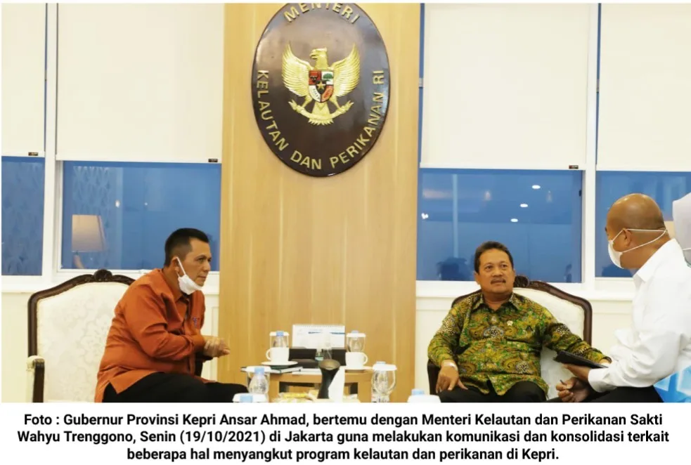 cMczone.com – Gubernur Provinsi Kepulauan Riau (Kepri) Ansar Ahmad, bertemu dengan Menteri Kelautan dan Perikanan Sakti Wahyu Trenggono, Senin (19/10/2021) di Jakarta guna melakukan komunikasi dan konsolidasi terkait beberapa hal menyangkut program kelautan dan perikanan di Kepri.