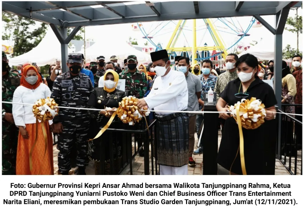 cMczone.com – Gubernur Provinsi Kepulauan Riau (Kepri) Ansar Ahmad bersama Walikota Tanjungpinang Rahma, meresmikan pembukaan Trans Studio Garden Tanjungpinang, Jum’at (12/11/2021) yang ditandai dengan pemotongan pita.