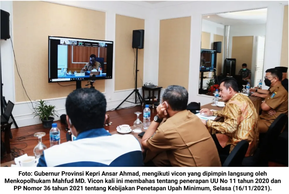 Ansar mengikuti vicon ini dari ruang rapat Hotel Swiss Bell di Kota Batam dan didampingi oleh Pj Sekdaprov Kepri Lamidi, Asisten Ekbang Syamsul Bahrum, Kadisnaker Provinsi Kepri Mangara M Simarmata dan Staf Khusus Gubernur Kepri Angelinus.