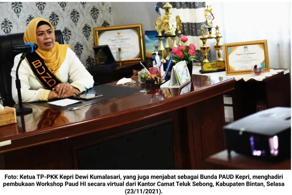 cMczone.com – Ketua TP-PKK Kepulauan Riau (Kepri) Dewi Kumalasari, yang juga menjabat sebagai Bunda PAUD Kepri, menghadiri pembukaan Workshop Paud HI secara virtual dari Kantor Camat Teluk Sebong, Kabupaten Bintan, Selasa (23/11/2021).