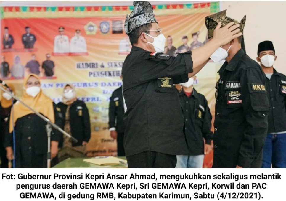 Karimun, cMczone.com – Gubernur Provinsi Kepulauan Riau (Kepri) Ansar Ahmad, mengukuhkan sekaligus melantik pengurus daerah Gerakan Penjaga Marwah (GEMAWA) Kepri, Sri GEMAWA Kepri, Koordinator Wilayah (Korwil) dan PAC GEMAWA di gedung Rumpun Melayu Bersatu (RMB), Kabupaten Karimun, Sabtu (4/12/2021).