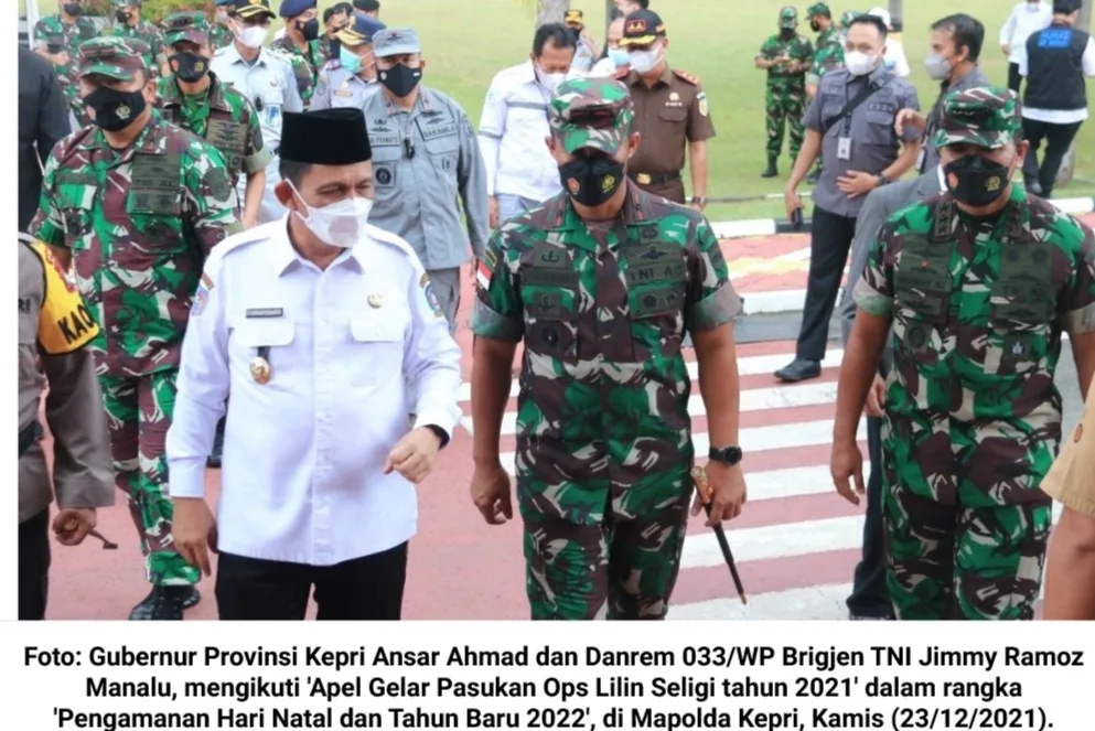 Batam, cMczone.com – Danrem 033/WP Brigjen TNI Jimmy Ramoz Manalu, mengikuti ‘Apel Gelar Pasukan Ops Lilin Seligi tahun 2021’ dalam rangka ‘Pengamanan Hari Natal dan Tahun Baru 2022’, di Markas Kepolisian Daerah (Mapolda) Kepulauan Riau (Kepri), Kamis (23/12/2021).