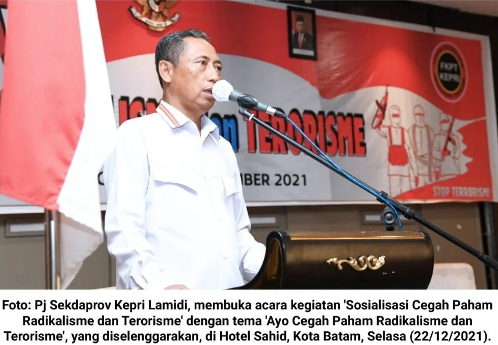 Lamidi hadir membuka acara kegiatan ‘Sosialisasi Cegah Paham Radikalisme dan Terorisme’ dengan tema ‘Ayo Cegah Paham Radikalisme dan Terorisme’, yang diselenggarakan Selasa (22/12/2021), di Hotel Sahid, Kota Batam, dengan peserta para pemuda, mahasiswa, organisasi keagamaan, dan organisasi masyarakat.