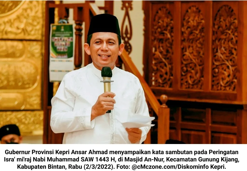 Bintan, cMczone.com – Gubernur Provinsi Kepulauan Riau (Kepri) Ansar Ahmad, didampingi Pj Sekdaprov Kepri Eko Sumbaryadi, dan Ketua Badan Kontak Majelis Taklim (BKMT) Kepri Dewi Kumalasari, menghadiri Peringatan Isra’ mi’raj Nabi Muhammad SAW 1443 H, di Masjid An-Nur, Kecamatan Gunung Kijang, Kabupaten Bintan, Rabu (2/3/2022).