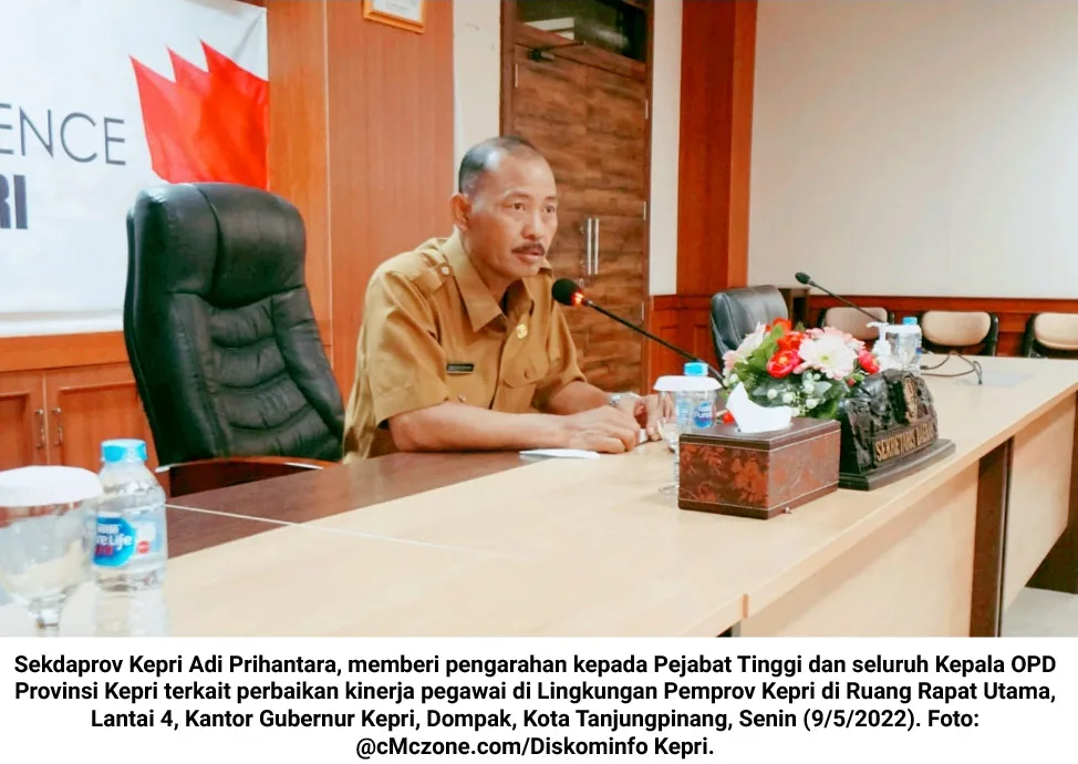 cMczone.com – Sekretaris Daerah Provinsi Kepulauan Riau (Kepri) Adi Prihantara, memberi pengarahan kepada Pejabat Tinggi dan seluruh Kepala Organisasi Perangkat Daerah (OPD) Provinsi Kepri terkait perbaikan kinerja pegawai di Lingkungan Pemerintah Provinsi (Pemprov) Kepri di Ruang Rapat Utama, Lantai 4, Kantor Gubernur Kepri, Dompak, Kota Tanjungpinang, Senin (9/5/2022).