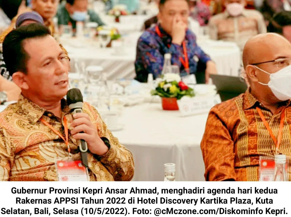 cMczone.com – Gubernur Provinsi Kepulauan Riau (Kepri) Ansar Ahmad yang didampingi Kepala Dinas Komunikasi dan Informatika (Kominfo) Kepri Hasan, menghadiri agenda hari kedua Rapat Kerja Nasional (Rakernas) Asosiasi Pemerintah Provinsi Seluruh Indonesia (APPSI) Tahun 2022 di Hotel Discovery Kartika Plaza, Kuta Selatan, Bali, Selasa (10/5/2022).