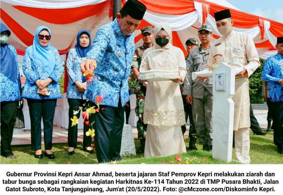 cMczone.com – Gubernur Provinsi Kepulauan Riau (Kepri) Ansar Ahmad, beserta jajaran Staf Pemerintah Provinsi (Pemprov) Kepri melakukan ziarah dan tabur bunga sebagai rangkaian kegiatan Hari Kebangkitan Nasional (Harkitnas) Ke-114 Tahun 2022 di Taman Makam Pahlawan (TMP) Pusara Bhakti, Jalan Gatot Subroto, Kota Tanjungpinang, Jum’at (20/5/2022).