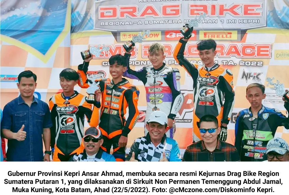 cMczone.com – Gubernur Provinsi Kepulauan Riau (Kepri) Ansar Ahmad, membuka secara resmi Kejuaraan Nasional (Kejurnas) Drag Bike Region Sumatera Putaran 1, yang dilaksanakan di Sirkuit Non Permanen (NP) Temenggung Abdul Jamal, Muka Kuning, Kota Batam, Ahad (22/5/2022).