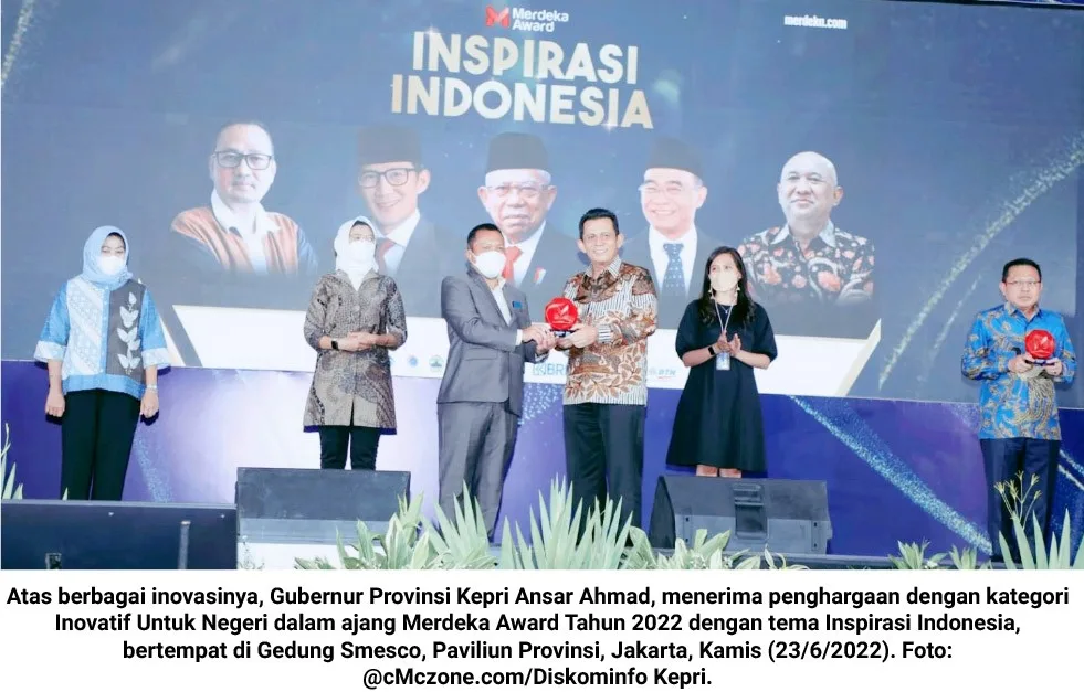 Atas berbagai inovasinya, Ansar yang juga mantan Bupati Bintan dua periode ini menerima penghargaan dengan kategori Inovatif Untuk Negeri dalam ajang Merdeka Award Tahun 2022 dengan tema Inspirasi Indonesia, Kamis (23/6/2022) bertempat di Gedung Smesco, Paviliun Provinsi, Jakarta.