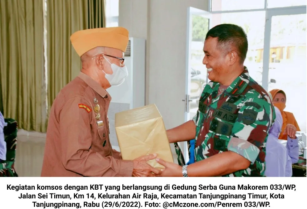 Kegiatan komsos dengan KBT ini berlangsung di Gedung Serba Guna Makorem 033/WP, Jalan Sei Timun, Km 14, Kelurahan Air Raja, Kecamatan Tanjungpinang Timur, Kota Tanjungpinang, Rabu (29/6/2022).