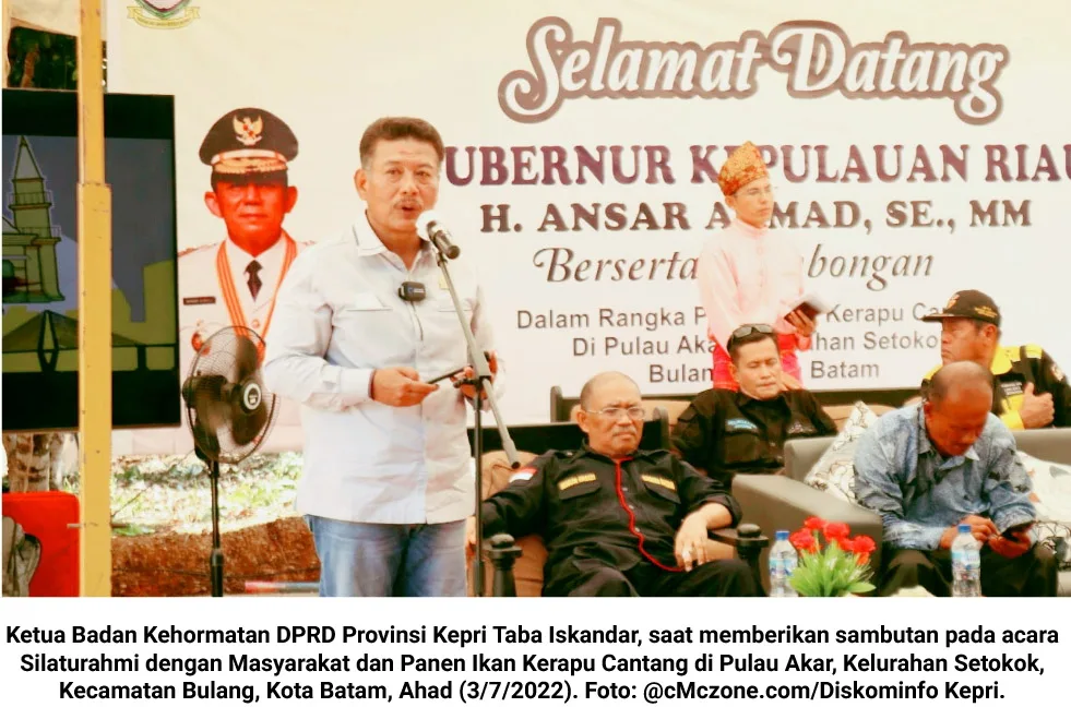 Hal tersebut dikatakan oleh Ketua Badan Kehormatan DPRD Provinsi Kepri Taba Iskandar, saat memberikan sambutan pada acara Silaturahmi dengan Masyarakat dan Panen Ikan Kerapu Cantang di Pulau Akar, Kelurahan Setokok, Kecamatan Bulang, Kota Batam, Ahad (3/7/2022).
