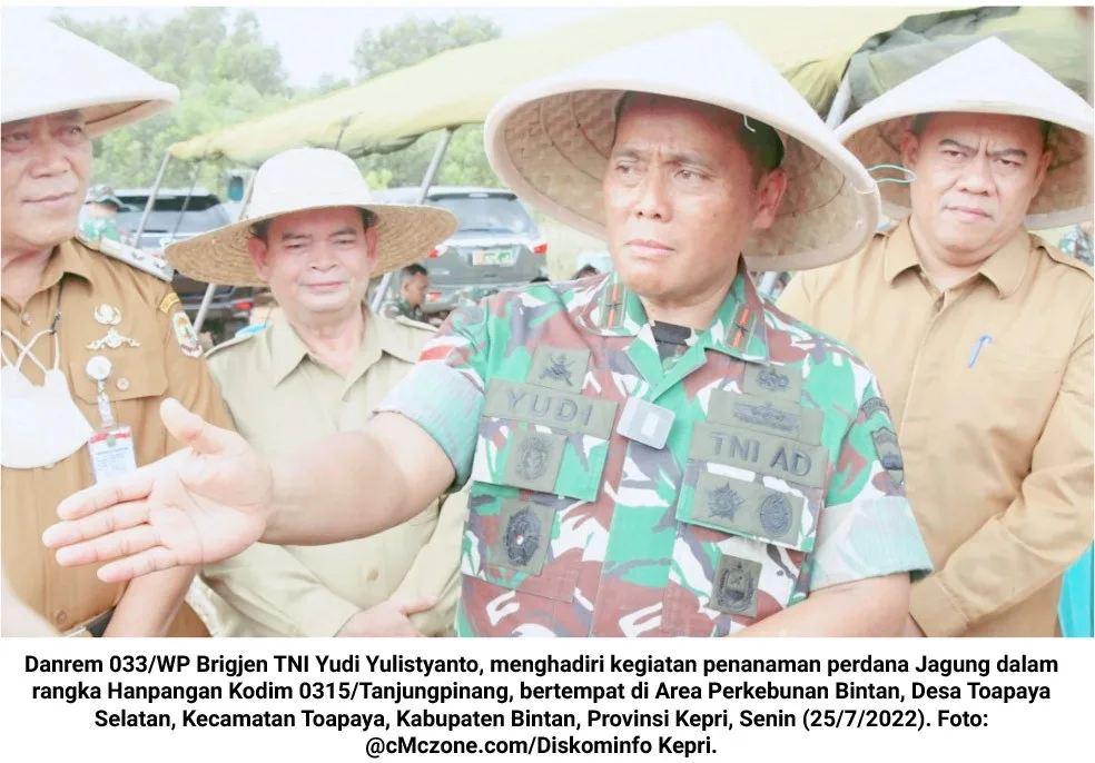 cMczone.com – Danrem 033/WP Brigjen TNI Yudi Yulistyanto, menghadiri kegiatan penanaman perdana Jagung dalam rangka Ketahanan Pangan (Hanpangan) Kodim 0315/Tanjungpinang di Kabupaten Bintan, bertempat di Area Perkebunan Bintan, Desa Toapaya Selatan, Kecamatan Toapaya, Kabupaten Bintan, Provinsi Kepulauan Riau (Kepri), Senin (25/7/2022).