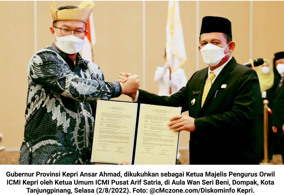 cMczone.com – Gubernur Provinsi Kepulauan Riau (Kepri) Ansar Ahmad, dikukuhkan sebagai Ketua Majelis Pengurus Organisasi Wilayah (Orwil) Ikatan Cendekiawan Muslim se-Indonesia (ICMI) Kepri oleh Ketua Umum ICMI Pusat Arif Satria, di Aula Wan Seri Beni, Dompak, Kota Tanjungpinang, Selasa (2/8/2022). Ansar akan memimpin Orwil ICMI Kepri untuk periode 2022-2027.
