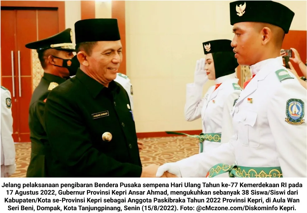 cMczone.com – Jelang pelaksanaan pengibaran Bendera Pusaka sempena Hari Ulang Tahun ke-77 Kemerdekaan Republik Indonesia pada 17 Agustus 2022, Gubernur Provinsi Kepulauan Riau (Kepri) Ansar Ahmad, mengukuhkan sebanyak 38 Siswa/Siswi dari Kabupaten/Kota se-Provinsi Kepri sebagai Anggota Pasukan Pengibar Bendera Pusaka (Paskibraka) Tahun 2022 Provinsi Kepri.