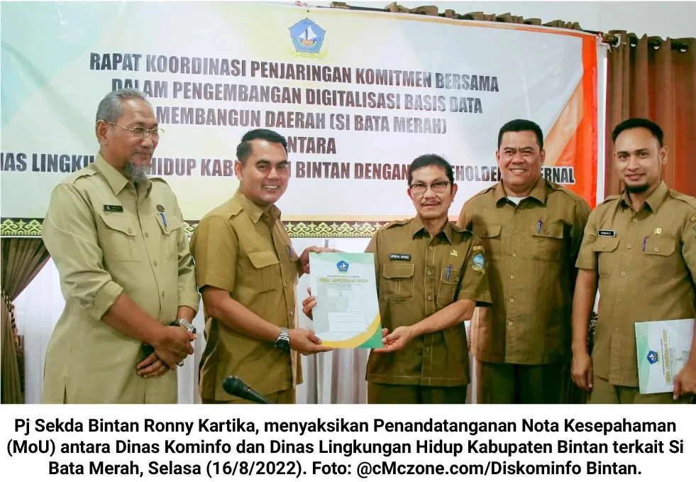 Munculnya terobosan ini terlihat saat Penjabat (Pj) Sekretaris Daerah (Sekda Bintan) Ronny Kartika, menyaksikan Penandatanganan Nota Kesepahaman atau Memorandum of Understanding (MoU) antara Dinas Komunikatif dan Informatika (Kominfo) dan Dinas Lingkungan Hidup Kabupaten Bintan terkait Si Bata Merah, Selasa (16/8/2022).