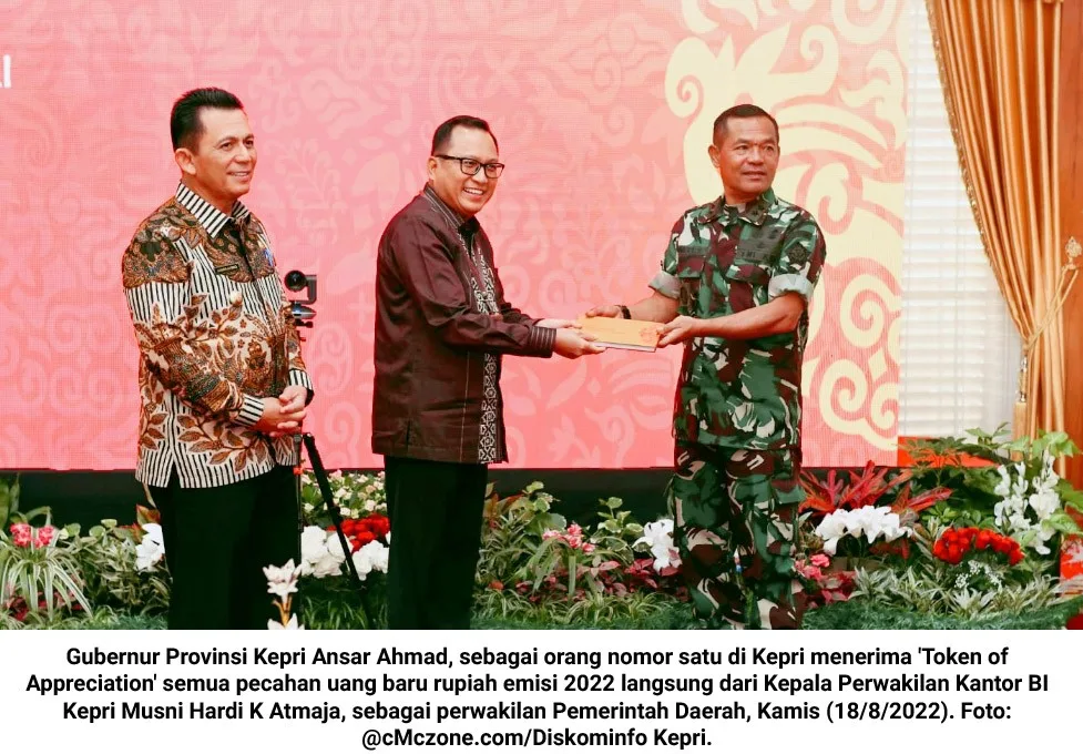 Usai menyaksikan peluncuran Uang Rupiah Kertas Tahun Emisi 2022, Ansar sebagai orang nomor satu di Kepri menerima ‘Token of Appreciation’ semua pecahan uang baru rupiah emisi 2022 langsung dari Kepala Perwakilan Kantor BI Kepri Musni Hardi K Atmaja, sebagai perwakilan Pemerintah Daerah.