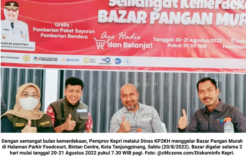 cMczone.com – Dengan semangat bulan kemerdekaan, Pemerintah Provinsi (Pemprov) Kepulauan Riau (Kepri) melalui Dinas Ketahanan Pangan, Pertanian, dan Kesehatan Hewan (KP2KH) menggelar Bazar Pangan Murah di Halaman Parkir Foodcourt, Bintan Centre, Kota Tanjungpinang, Sabtu (20/8/2022). Bazar digelar selama 2 hari mulai tanggal 20-21 Agustus 2022 pukul 7.30 WIB pagi.