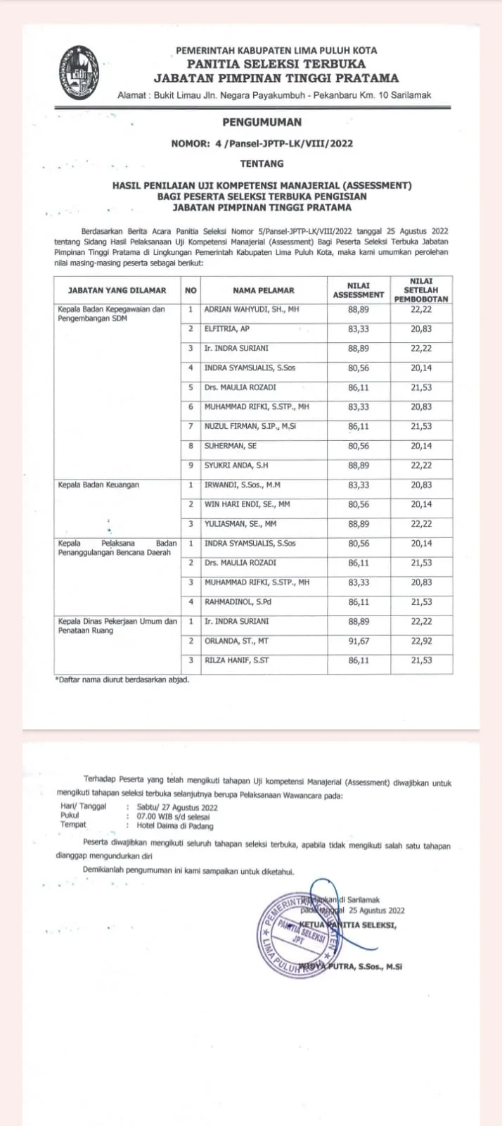 Pengumuman dengan Nomor : 4 /Pansel-JPTP-LK/VIII/2022 tersebut ditanda tangani oleh Sekretaris Daerah (Sekda) Kabupaten Limapuluh Kota, Widya Chandra.