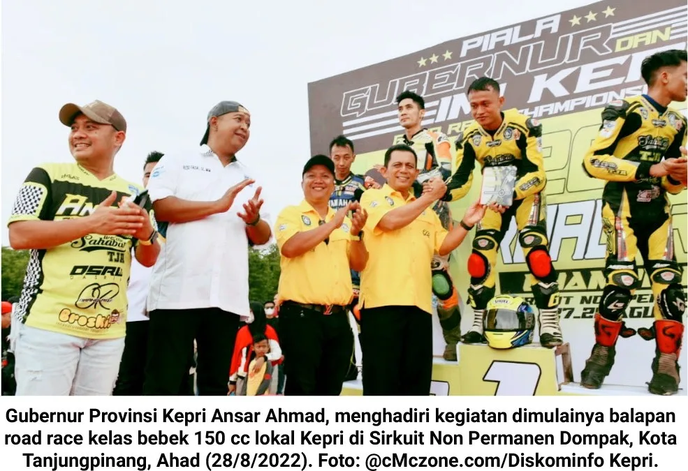 cMczone.com – Gubernur Provinsi Kepulauan Riau (Kepri) Ansar Ahmad, mengibarkan bendera start tanda dimulainya balapan road race kelas bebek 150 cc lokal Kepri di Sirkuit Non Permanen Dompak, Kota Tanjungpinang, Ahad (28/8/2022).
