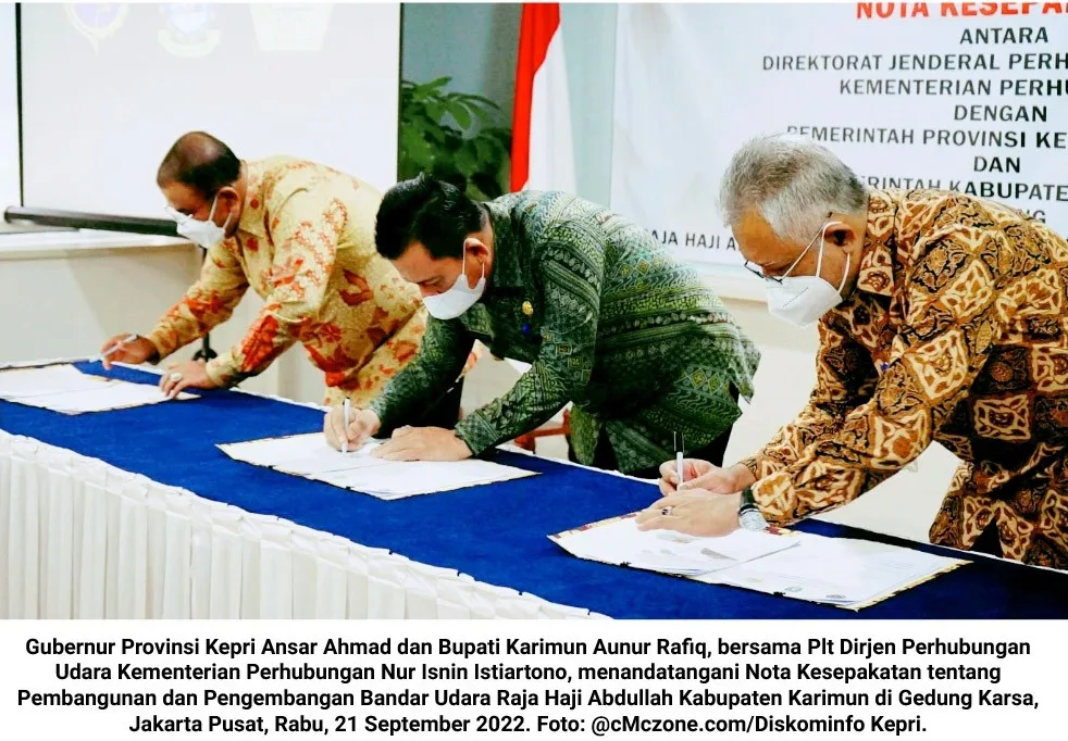cMczone.com – Gubernur Provinsi Kepulauan Riau (Kepri) Ansar Ahmad dan Bupati Karimun Aunur Rafiq, bersama Pelaksana Tugas (Plt) Dirjen Perhubungan Udara Kementerian Perhubungan Nur Isnin Istiartono, menandatangani Nota Kesepakatan tentang Pembangunan dan Pengembangan Bandar Udara Raja Haji Abdullah (RHA) Kabupaten Karimun di Gedung Karsa, Jakarta Pusat, Rabu, 21 September 2022.