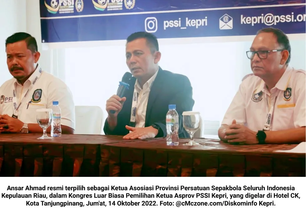 cMczone.com – Ansar Ahmad resmi terpilih sebagai Ketua Asosiasi Provinsi (Asprov) Persatuan Sepakbola Seluruh Indonesia (PSSI) Kepulauan Riau (Kepri) dalam Kongres Luar Biasa Pemilihan Ketua Asprov PSSI Kepri, yang digelar di Hotel CK, Kota Tanjungpinang, Jum’at, 14 Oktober 2022.