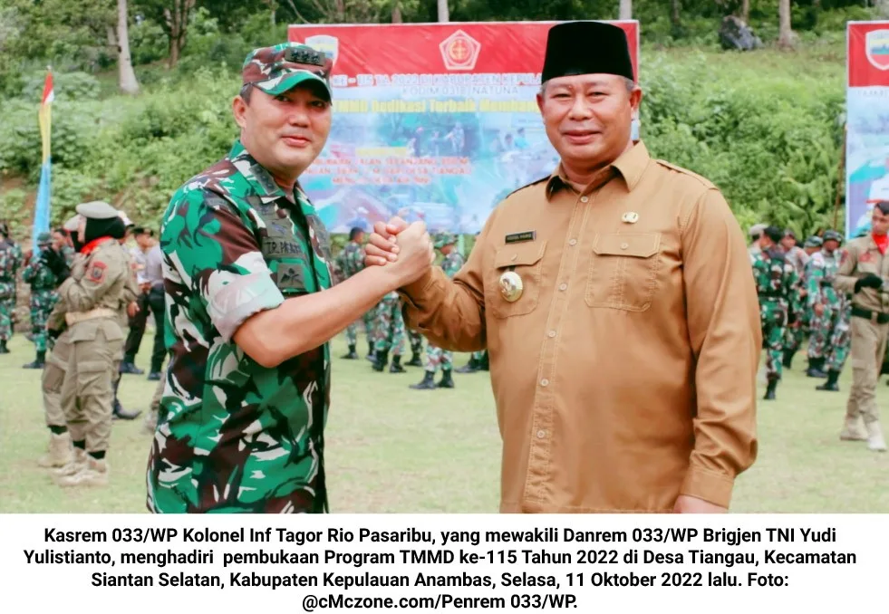 cMczone.com – Kasrem 033/WP Kolonel Inf Tagor Rio Pasaribu, yang mewakili Danrem 033/WP Brigjen TNI Yudi Yulistianto, menghadiri  pembukaan Program TNI Manunggal Membangun Desa (TMMD) ke-115 Tahun 2022 di Desa Tiangau, Kecamatan Siantan Selatan, Kabupaten Kepulauan Anambas, Selasa, 11 Oktober 2022 lalu.