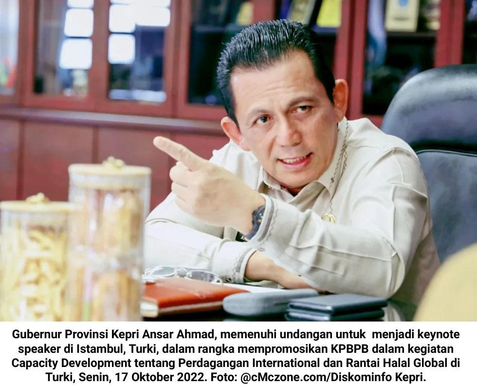 cMczone.com – Gubernur Provinsi Kepulauan Riau (Kepri) Ansar Ahmad, memenuhi undangan untuk menjadi keynote speaker di Istambul, Turki, dalam rangka mempromosikan Kawasan Perdagangan Bebas dan Pelabuhan Bebas (KPBPB) dalam kegiatan Capacity Development tentang Perdagangan International dan Rantai Halal Global di Turki, Senin, 17 Oktober 2022.