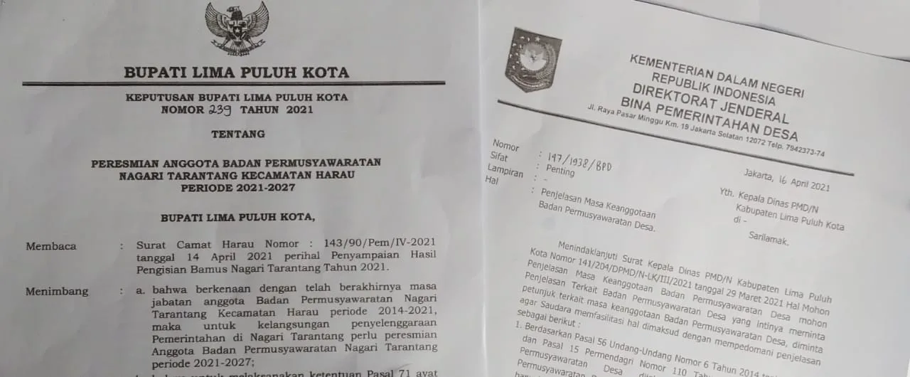 Cmczone.com– Keputusan Bupati Limapuluh Kota Nomor 239 tahun 2021 tentang Peresmian Anggota Badan Permusyawaratan Nagari Tarantang Kecamatan Harau Periode 2021-2027, tanggal 15 Juni 2021 berpotensi melanggar UU No.6 tahun 2014 pasal 56 dan Permendagri No.110 tahun 2016 Pasal 15.