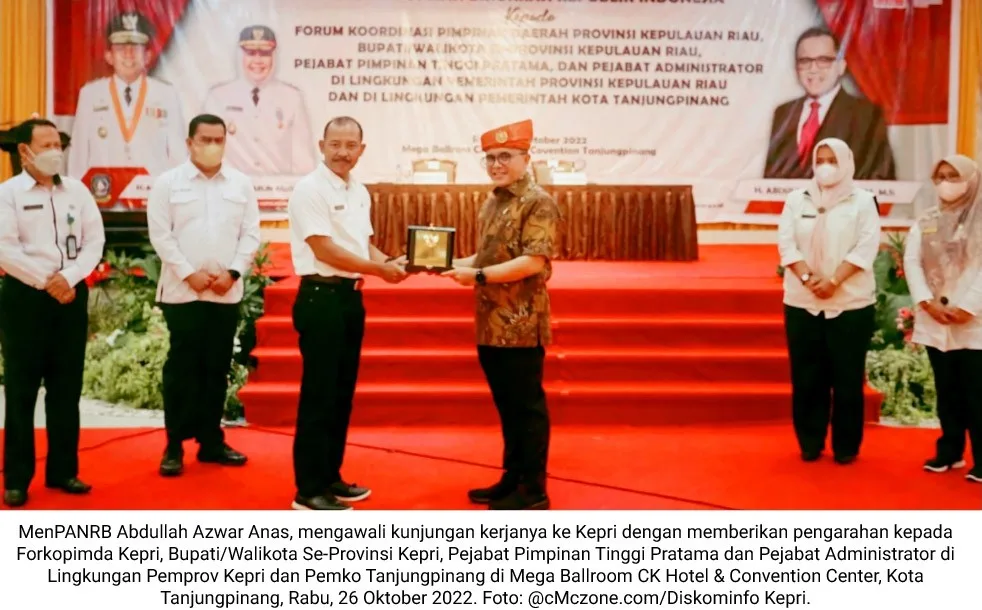 cMczone.com – Menteri Pendayagunaan Aparatur Negara dan Reformasi Birokrasi (MenPANRB) Abdullah Azwar Anas, mengawali kunjungan kerjanya ke Kepulauan Riau (Kepri) dengan memberikan pengarahan kepada Forum Koordinasi Pimpinan Daerah (Forkopimda) Kepri, Bupati/Walikota Se-Provinsi Kepri, Pejabat Pimpinan Tinggi Pratama dan Pejabat Administrator di Lingkungan Pemerintah Provinsi (Pemprov) Kepri dan Pemerintah Kota (Pemko) Tanjungpinang di Mega Ballroom CK Hotel & Convention Center, Kota Tanjungpinang, Rabu, 26 Oktober 2022.