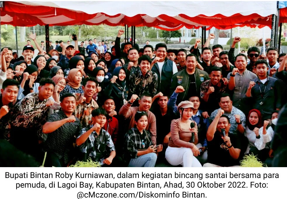 cMczone.com – Bupati Bintan Roby Kurniawan, tertawa lepas saat berbincang santai bersama para pemuda, di Lagoi Bay, Kabupaten Bintan, Ahad, 30 Oktober 2022.