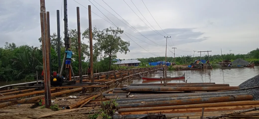 Saat ini, pihak kontraktor sedang mengerjakan pembangunan struktur bawah jembatan yang meliputi tiang jembatan.