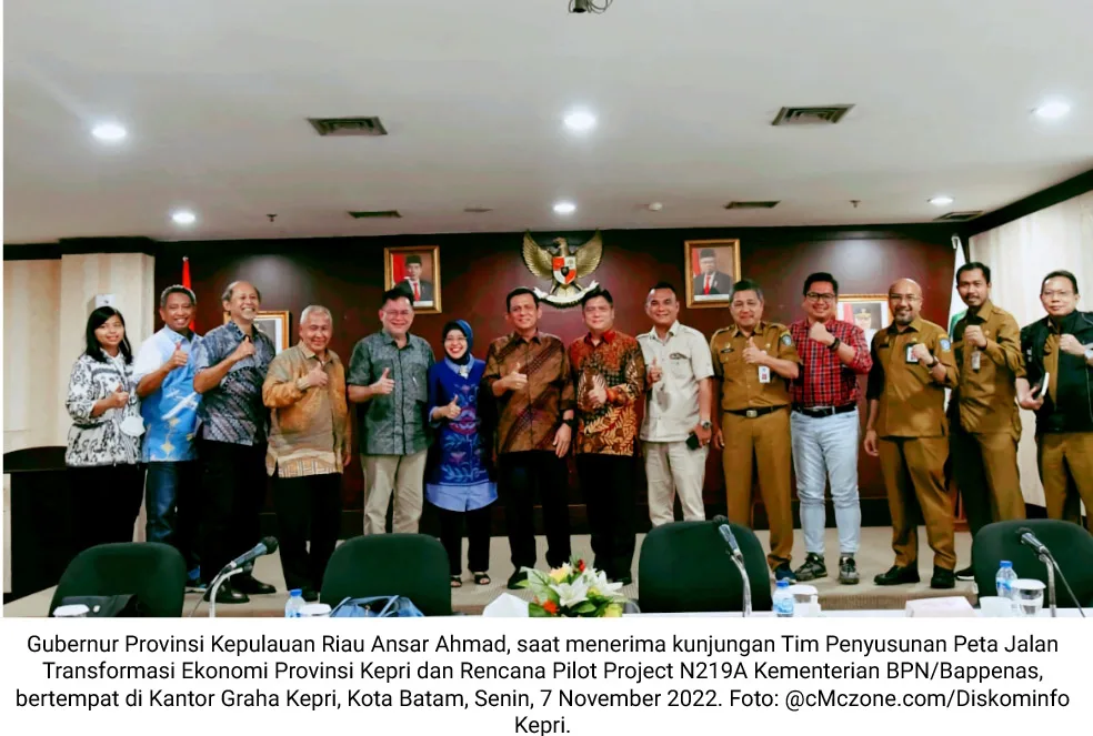 Dukungan tersebut disampaikan Ansar, saat menerima kunjungan Tim Penyusunan Peta Jalan Transformasi Ekonomi Provinsi Kepri dan Rencana Pilot Project N219A Kementerian BPN/Bappenas, bertempat di Kantor Graha Kepri, Kota Batam, Senin, 7 November 2022.