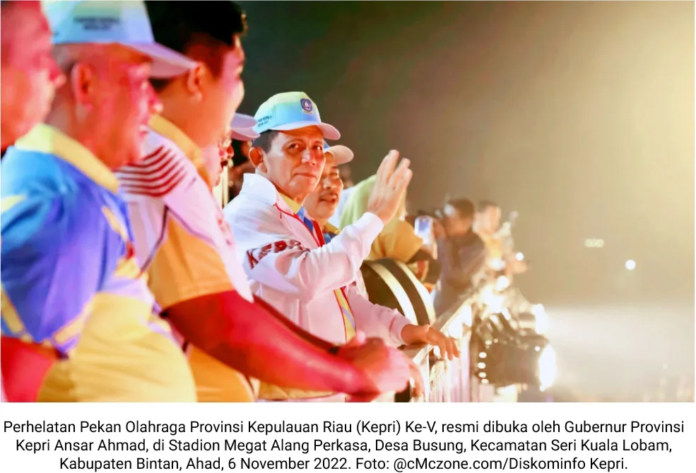 cMczone.com – Perhelatan Pekan Olahraga Provinsi (Porprov) Kepulauan Riau (Kepri) Ke-V, resmi dibuka oleh Gubernur Provinsi Kepri Ansar Ahmad, di Stadion Megat Alang Perkasa, Desa Busung, Kecamatan Seri Kuala Lobam, Kabupaten Bintan, Ahad, 6 November 2022. Porprov Kepri Ke-V ini akan digelar dari tanggal 6-12 November 2022.