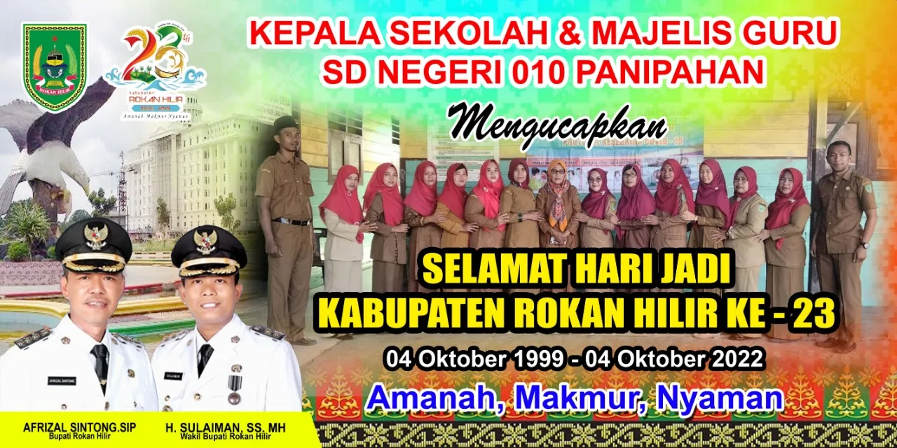 ROHIL – cmczone.com – Bagansiapiapi , Senin , 26 September 2022 – Pemerintah Daerah Kabupaten Rokan Hilir , SDN 010 panipahan ”Mengucapkan Selamat Hari Jadi Kabupaten Rokan Hilir Negeri Seribu Kubah yang ke 23 Tahun” , 04 Oktober 1999 – 04 Oktober 2022.