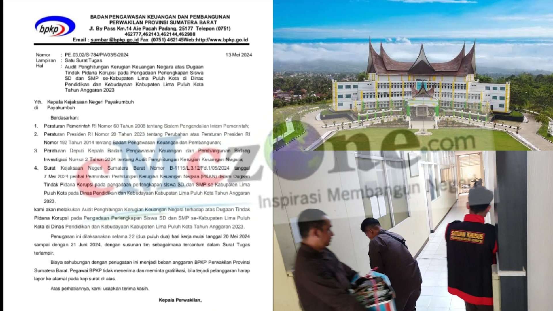 cMczone.com, Limapuluh Kota, Sumbar– Surat Perintah Tugas dari kepala perwakilan BPKP Provinsi Sumbar tertanggal 13 Mei 2024 selama 22 hari kerja dimulai sejak tanggal 20 Mei 2024 hingga tanggal 21 Juni 2024 dalam melaksanakan Audit pada pengadaan perlengkapan siswa SD dan SMP se Kabupaten Lima Puluh Kota pada dinas pendidikan dan kebudayaan Kabupaten Lima Puluh Kota tahun anggaran 2023.
