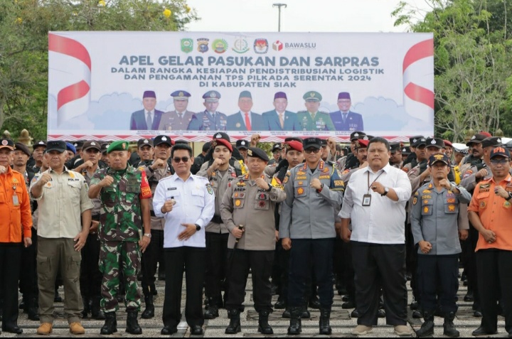 Apel yang berlangsung di halaman Kantor Bupati Siak ini diikuti oleh seluruh personel TNI, Polri, serta pengawas dan linmas yang akan terlibat dalam pengamanan pendistribusian logistik dan pengamanan tempat pemungutan suara (TPS) pada pelaksanaan Pilkada mendatang.