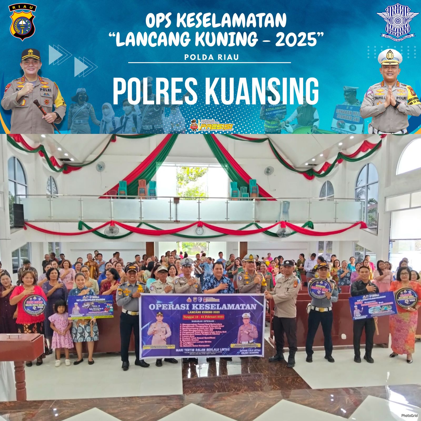 Kegiatan ini dihadiri oleh Kasat Lantas Polres Kuansing AKP A. Ramadhan, S.H., M.Si., personel Satgas Preemtif Ops Keselamatan Lancang Kuning 2025, personel Dinas Perhubungan (Dishub), serta Pendeta Desti Manoppo-Wowondatu, S.Si-Teol, bersama sekitar 150 jemaat Gereja GPIB Efrata.