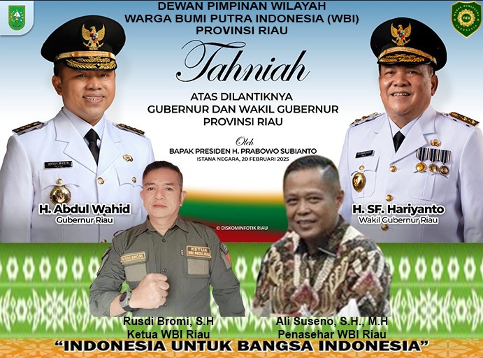 Rusdi Bromi Ketua Warga Bumi Putra Indonesia (WBI) Provinsi Riau turut mengucapkan Selamat dan Sukses atas Pelantikan Bapak H. Abduk Wahid, S.Pd.I., M.Si. dan Bapak Ir. H. SF. Hariyanto, M.T “Kami mendo`akan semoga Bapak menjadi Pemimpin yang baik dan selalu mendengarkan aspirasi rakyatnya, mengoptimalkan sumber daya daerah untuk penikatan ekonomi dan kesejahteraan Masyarakat Riau, semoga selalu dekat dengan masyarakat dan menjadi pemimpin yang dicintai” ucap Rusdi Bromi