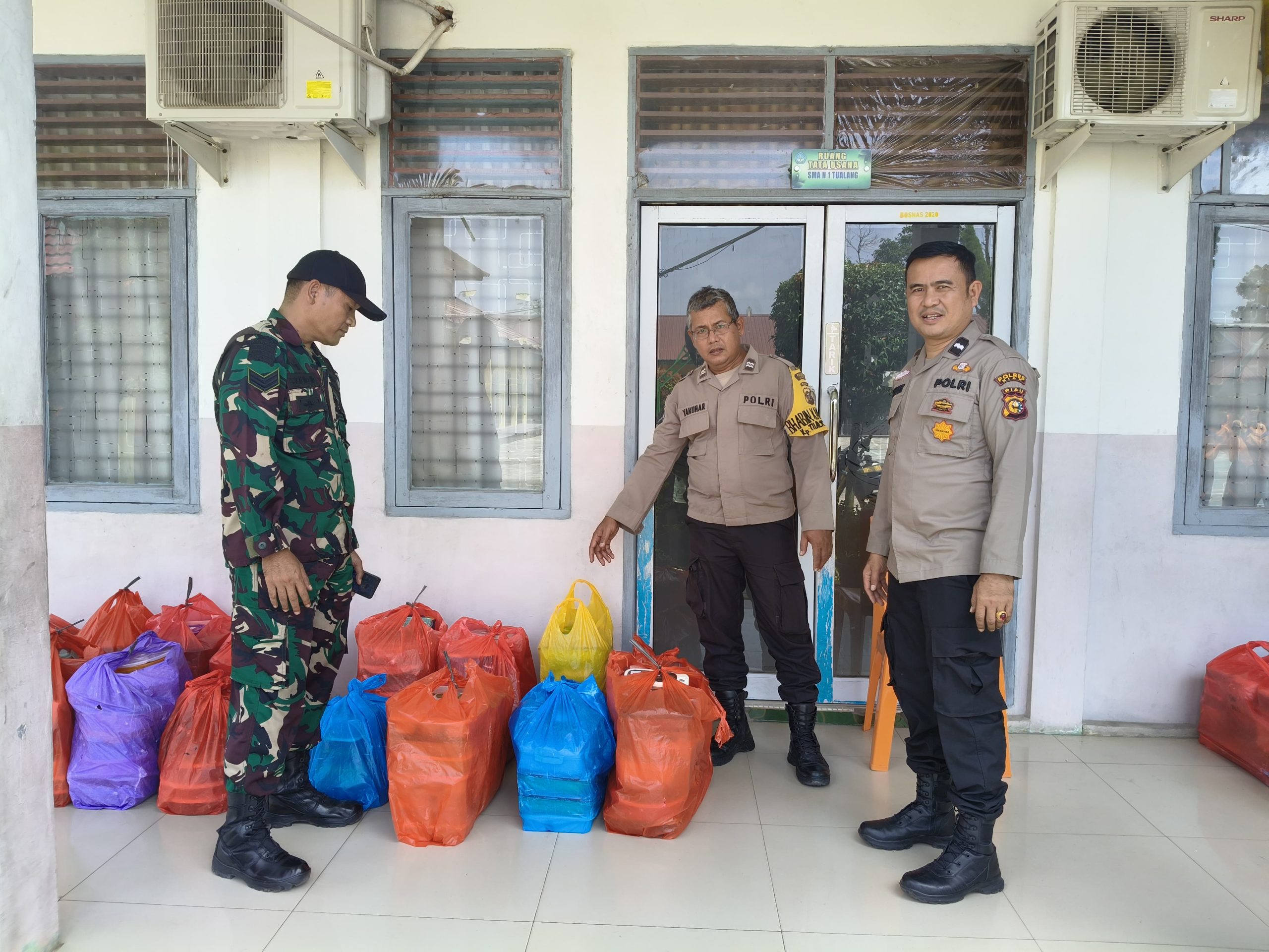 Tampak personil yang melaksanakan pendribusian Kanit Binmas Akp Hendra Budiman, Panit 1 Binmas Ipda Sugeng Mishari.SH, Panit 2 Binmas Aipda Markus Telaumbanua.SH, Bhabinkamtibmas dan 1 personil Bhabbinsa, terjun langsung untuk pendistribusian makan bergizi gratis di TK Umi Kalsum, SD Darul Faroh, SMA Negeri 1 dan SMA Negeri 5 Kecamatan Tualang Kabupaten Siak.