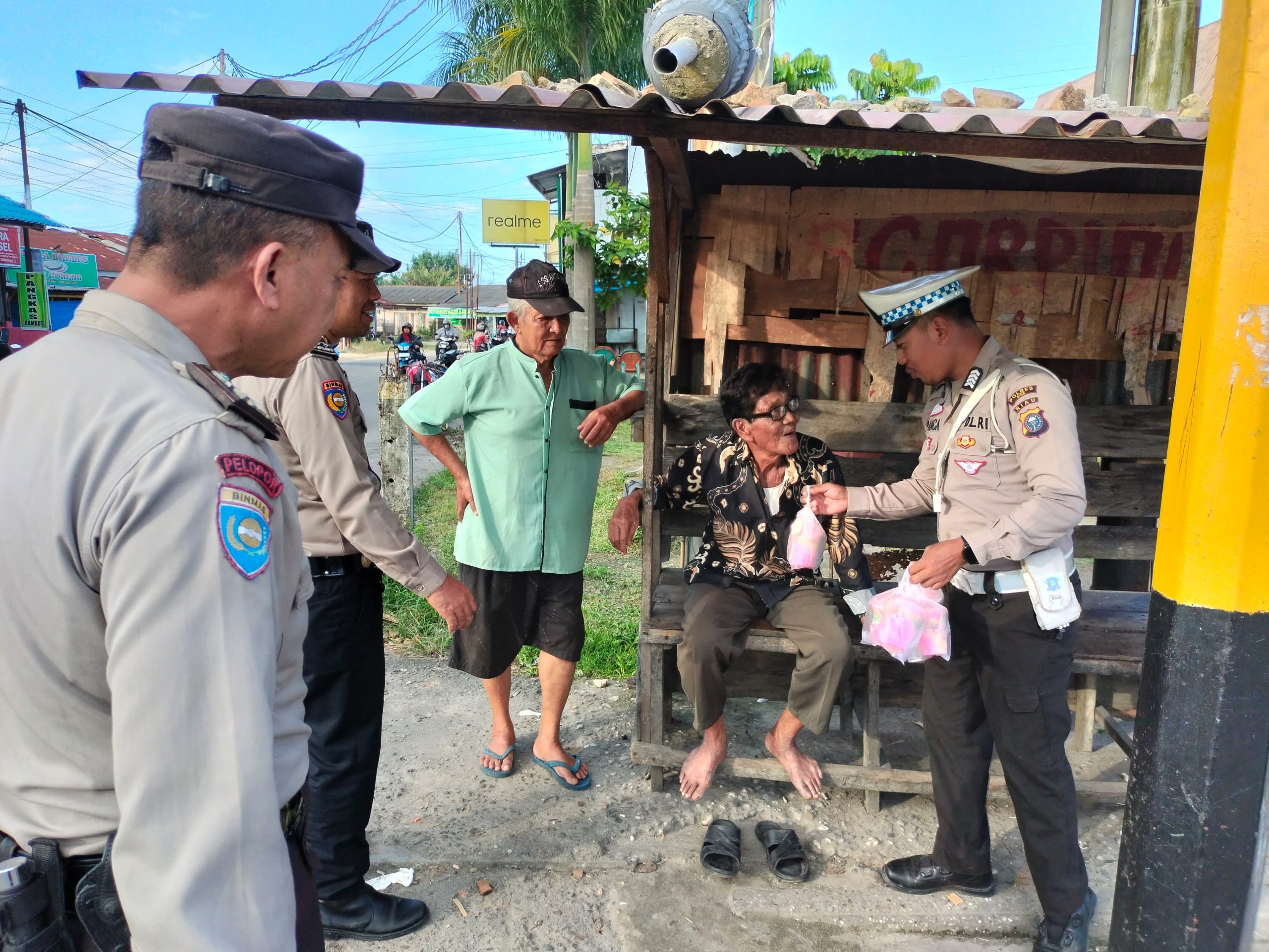 Sebanyak 50 bungkus takjil disalurkan kepada warga yang sedang beraktivitas melintas di Jalan Raya Km. 4 Kelurahan Perawang depan Pos Bhabinkamtibmas Kelurahan menjelang waktu berbuka puasa.