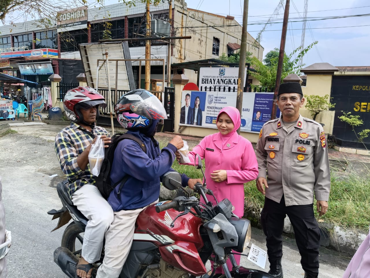 cMczone.com, Perawang – Dalam suasana keakraban dalam semangat kebersamaan dan kepedulian di bulan suci Ramadhan 1446 H, Polsek Tualang bersama Pengurus Bhayangkari Ranting Tualang menggelar kegiatan berbagi takjil gratis kepada pejalan kaki, pengendara roda dua dan warga sekitar yang melintas di depan Polsek Tualang, Sabtu (8/3/25) sore.