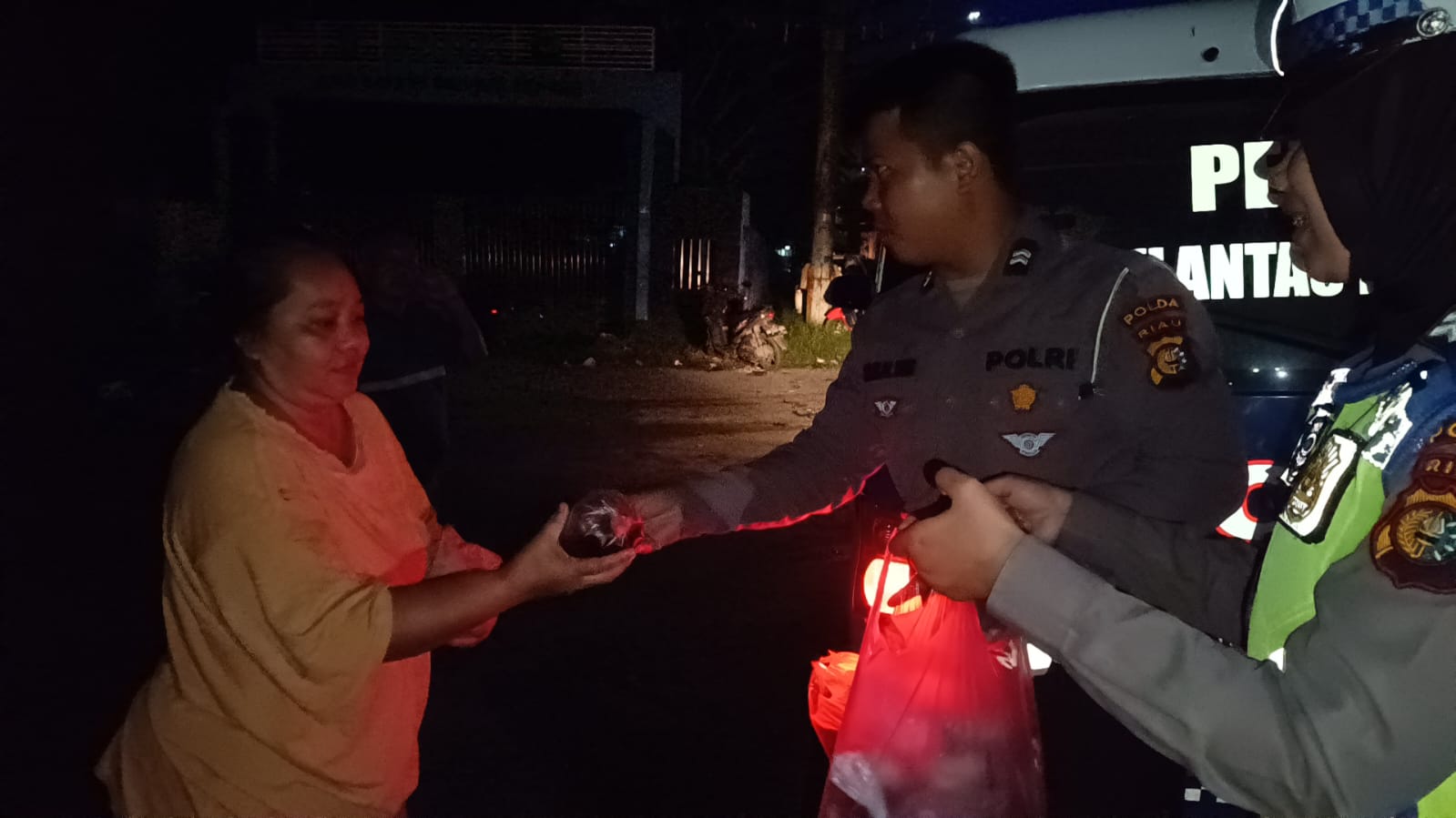 Tampak TIM Sahur On the road Ditlantas Polda Riau membagikan paket nasi bungkus untuk sahur, sambutan senyuman hangat masyarakat tampak menyambut tim Sahur On the road Ditlantas Polda Riau.