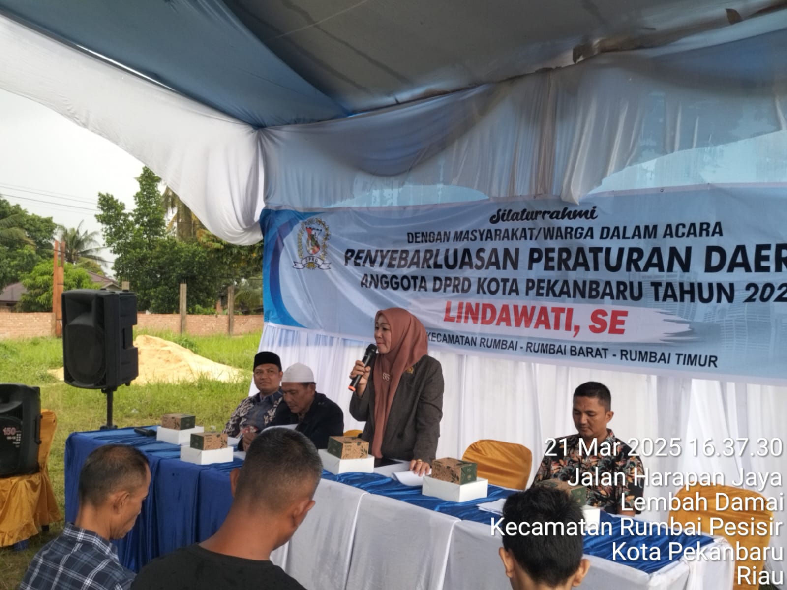 cMczone.com, Pekanbaru, – Anggota DPRD Kota Pekanbaru, Lindawati SE, menggelar acara silaturahmi dan penyebarluasan peraturan daerah (Perda) bersama masyarakat di Jalan Harapan Jaya, Kelurahan Lembah Damai, Kecamatan Rumbai, Jumat (21/3).