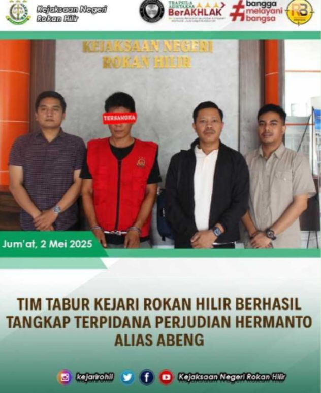 cMczone.com, Rokan Hilir – Pada hari Jumat, tanggal 2 Mei 2025, sekitar pukul 10.10 WIB, bertempat di Kecamatan Bangko, Kabupaten Rokan Hilir, Tim Tangkap Buronan (Tabur) bersama Jaksa Eksekutor Tindak Pidana Umum Kejaksaan Negeri Rokan Hilir berhasil melakukan penangkapan terhadap satu orang terpidana perkara tindak pidana perjudian atas nama Hermanto alias Abeng.