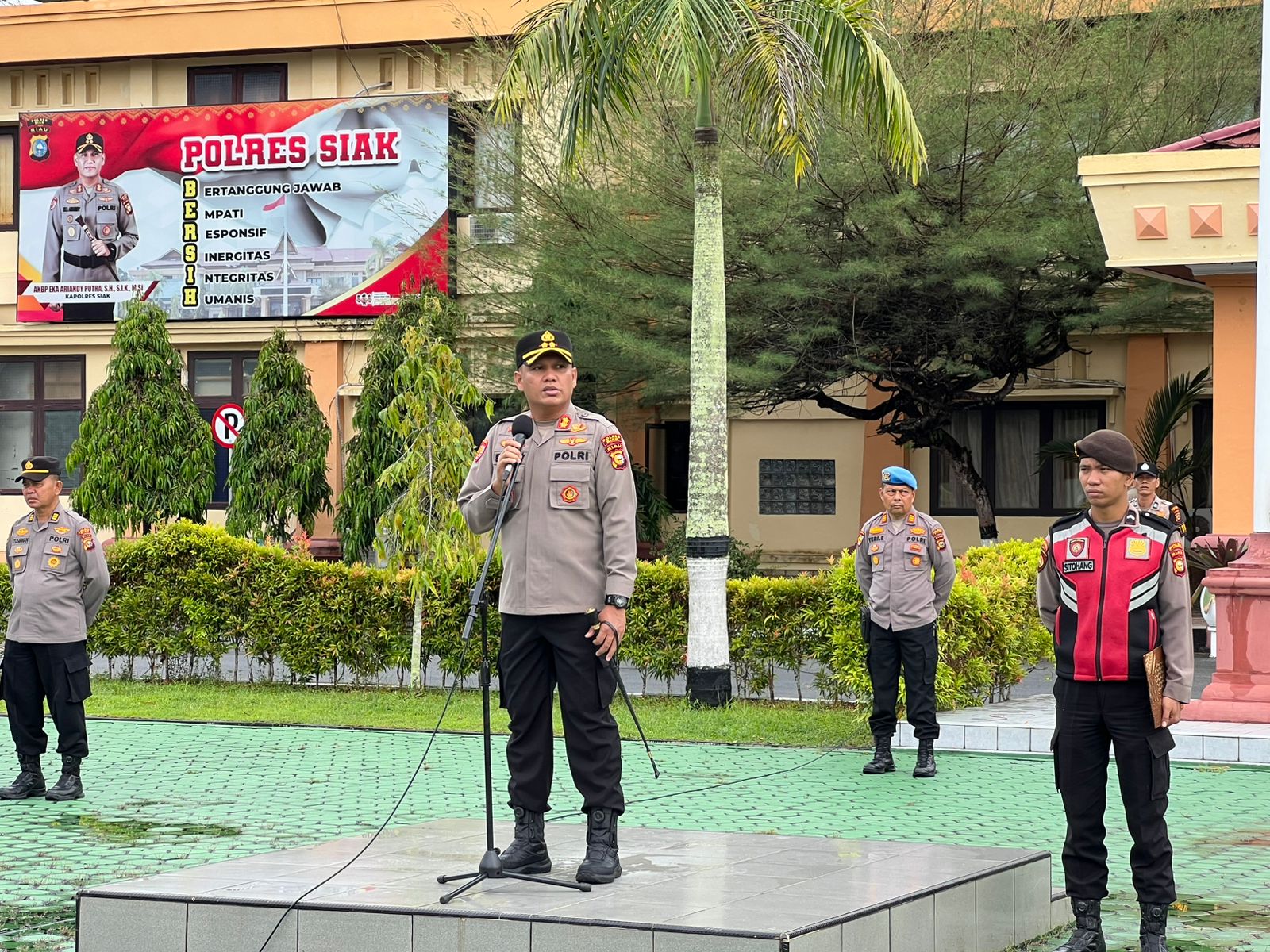 cMczone.com, Siak, 14 Mei 2025 — Kapolres Siak, AKBP Eka Ariandy Putra, S.H., S.I.K., M.Si., memimpin langsung apel pagi rutin yang digelar di lapangan apel Mapolres Siak pada Rabu (14/5/2025). Apel pagi ini menjadi momentum penting untuk menyampaikan arahan, apresiasi, serta penekanan disiplin kepada seluruh personel Polres Siak.