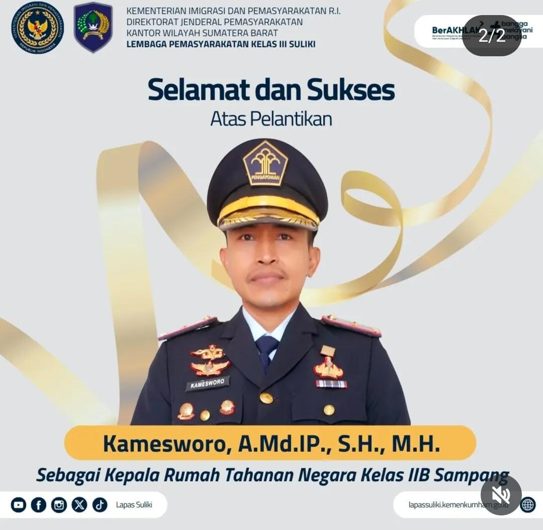 Karutan Sampang, Kamesworo menyampaikan komitmennya untuk melanjutkan tongkat estafet kepemimpinan Rutan Sampang, dengan menjaga amanah jabatan dan membangun kerja sama yang solid dalam membina para warga binaan serta menjaga keamanan dan ketertiban di rutan. Pelantikan ini menandai awal baru bagi Rutan Sampang dibawah Kepemimpinan Bapak Kamesworo untuk terus berbenah dan memberikan pelayanan yang humanis, sesuai dengan semangat reformasi birokrasi yang diusung Ditjenpas.