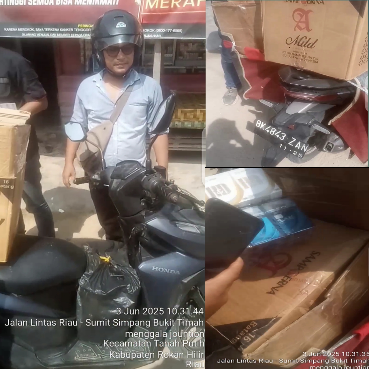 cMc.zone.com, Rohil – Di Temukan penjual Rokok ilegal, Oleh awak media dan LSM, yang menggunakan sebuah sepeda motor BK 4843 ZAN dan menggunakan kardus merek, SOEMPURNA. Di jalan Lintas Riau, Sumit Simpang Bukit Timah, menggala jountion kecamatan Tanah putih, kabubapaten Rokan hillir.03-06-2025