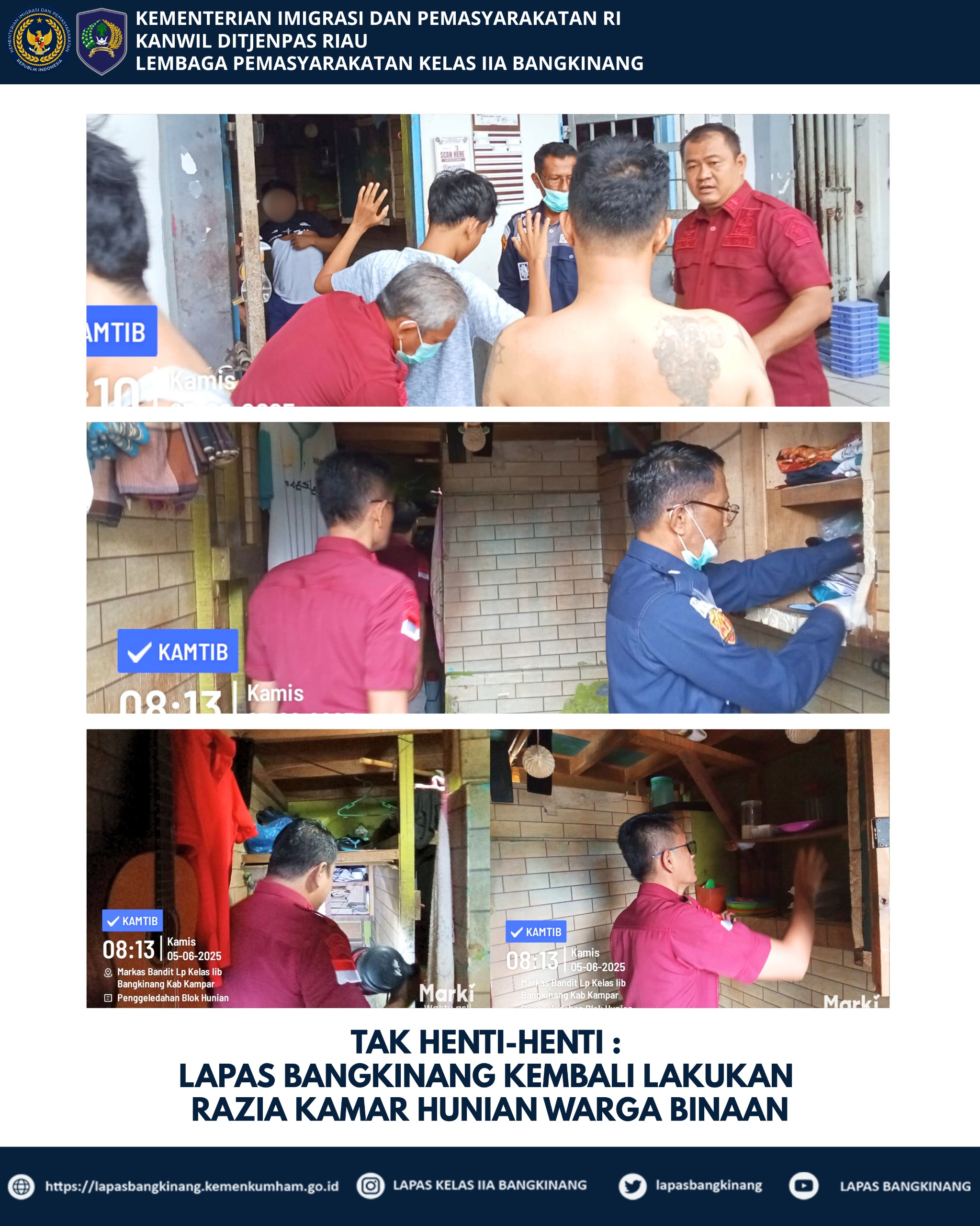 “Lapas IIA Bangkinang akan terus melakukan Antisipasi dan meningkatkan keamanan dalam rangka menciptakan suasana kondusif dan membangun pembinaan yang maksimal bagi warga binaan. Kegiatan ini sebagai upaya dan tindak lanjut dalam menjalankan arahan Menteri Imigrasi dan Pemasyarakatan, Bapak Agus andrianto. Kami akan terus melakukan kegiatan razia berkala seperti ini untuk mencegah segala bentuk pelanggaran dan gangguan keamanan di dalam Lapas. Ini adalah komitmen kami dalam mewujudkan organisasi yang bersih dan terbebas dari penyalahgunaan dan peredaran gelap narkoba dan barang-barang terlarang lainnya di lingkungan Lapas,” Tegas Alexander.